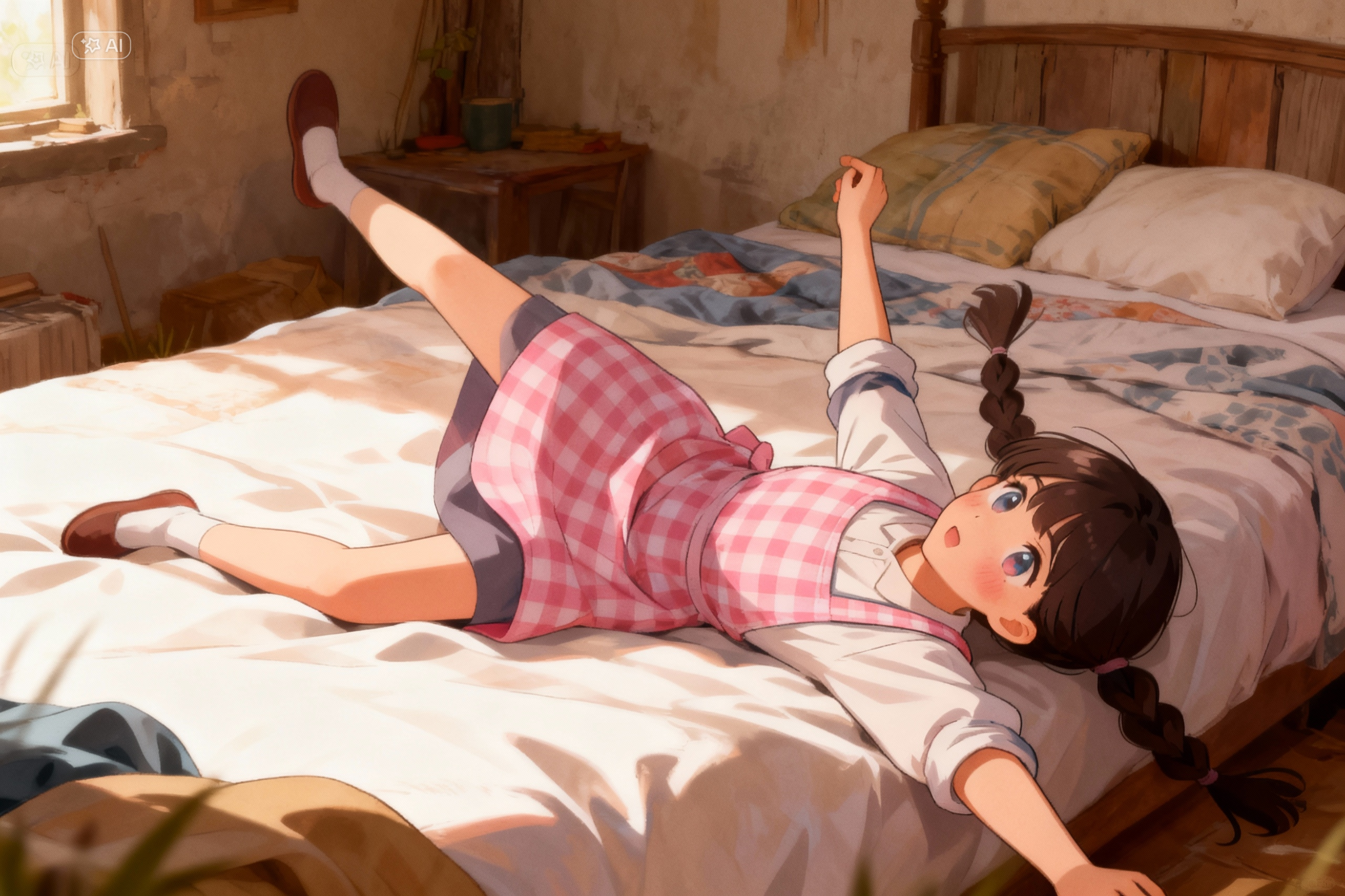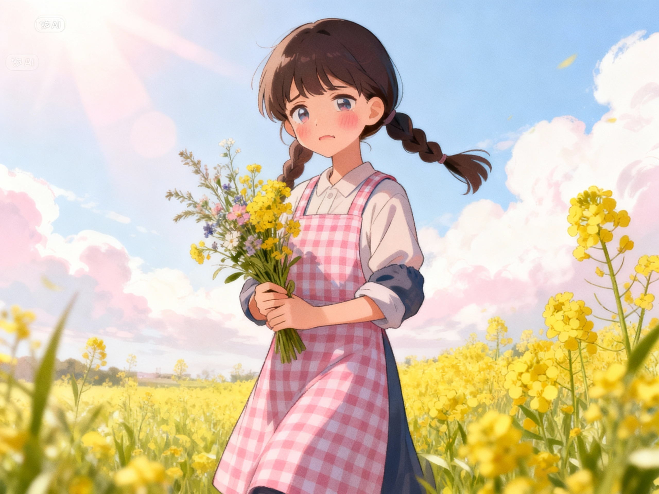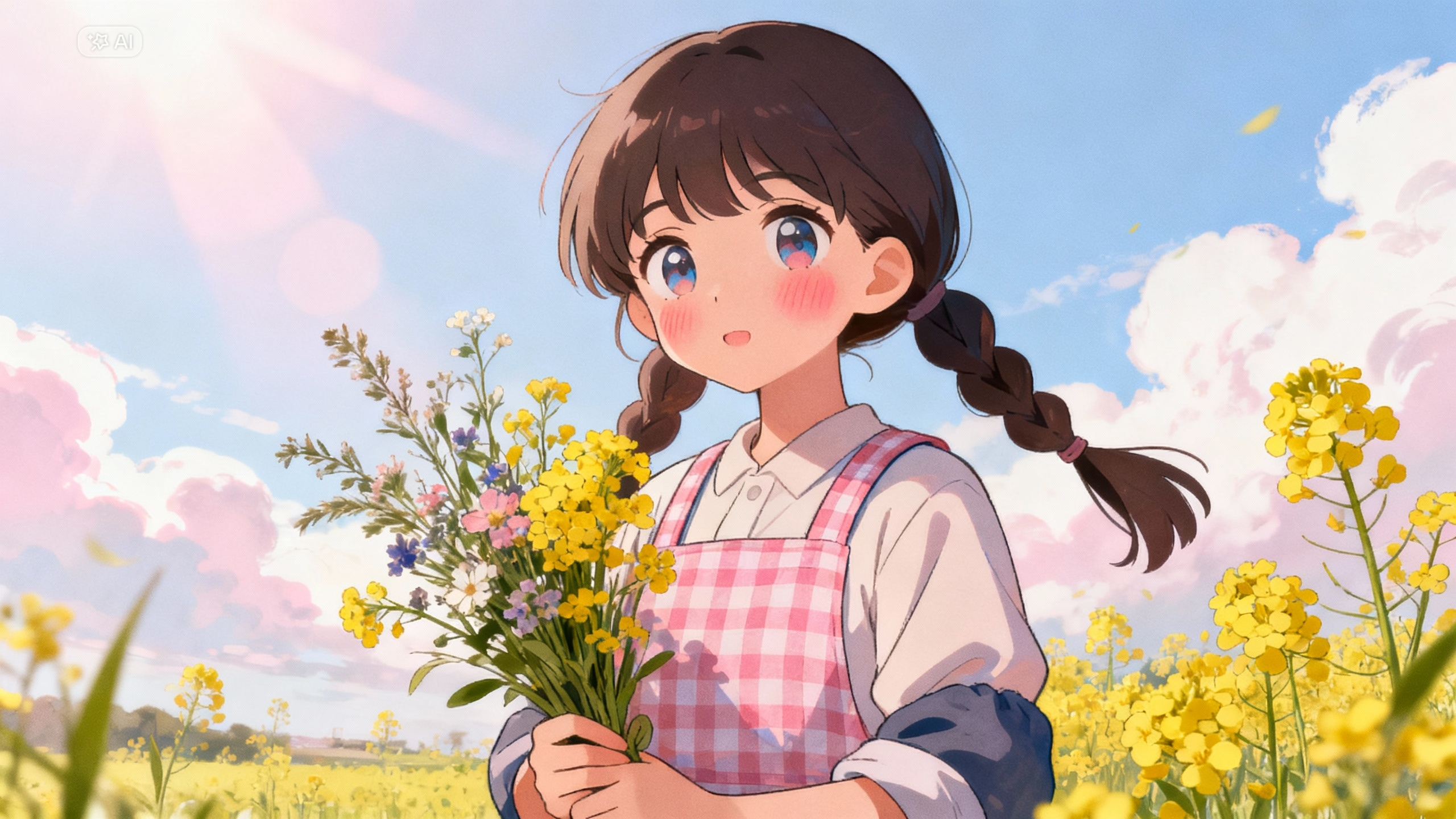 素朴な田園の風景の中で、三つ編みを揺らしながら笑う少女たち。